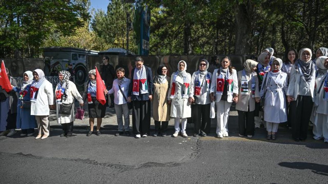 Beyaz kıyafetler giyen ve boyunlarına kefiye bağlayan kadınlar, ellerinde Filistin ve Türk bayraklarıyla "Filistin için tek yüreğiz", "Özgür Filistin", "İşgale son", "Filistin özgür olacak", "Barış kadınla mümkün" yazılı pankartlar taşıdı.