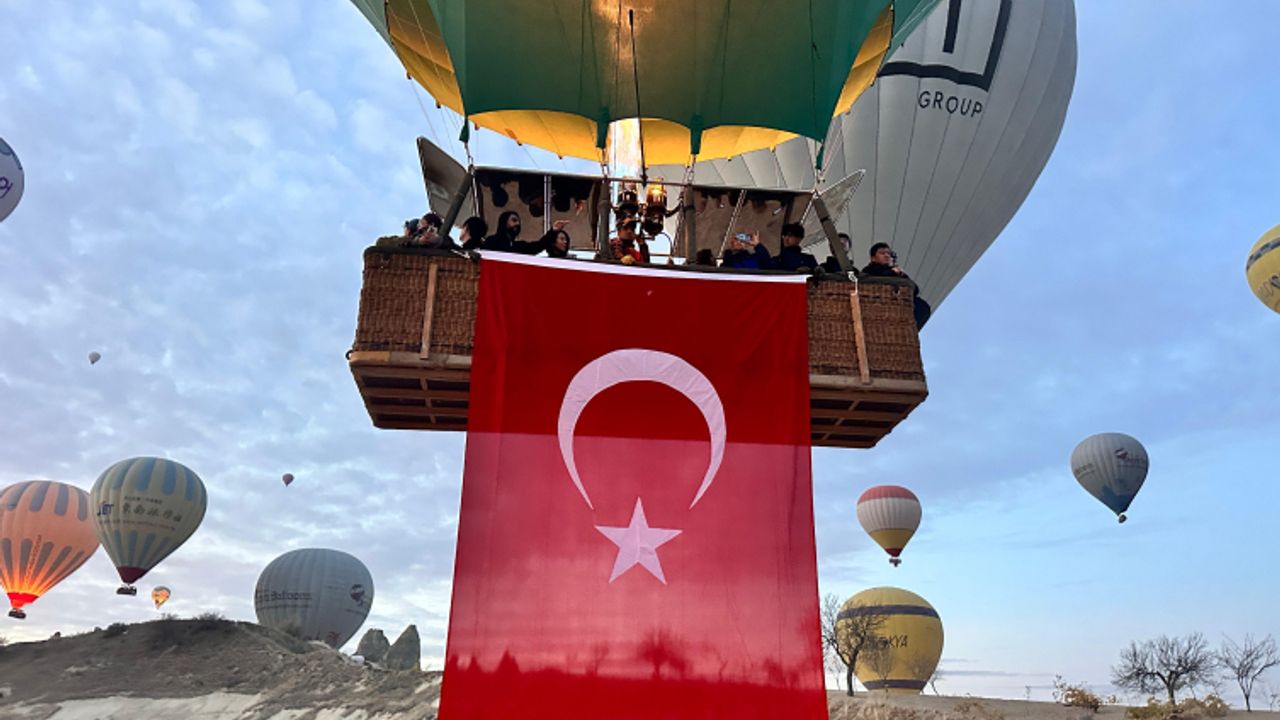 Nevşehir’in Göreme beldesinde, 10 Kasım Atatürk’ü Anma Günü dolayısıyla düzenlenen sıcak hava balonu turları özel bir atmosferde gerçekleştirildi.